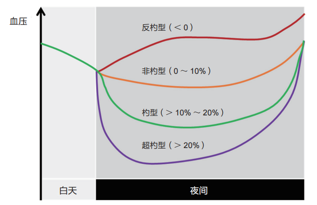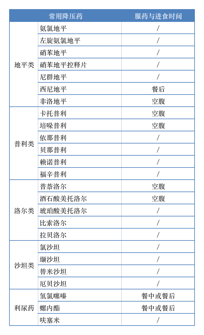 临床上常根据夜间血压下降比值将血压的昼夜节律分为杓型(>10%~20%)、非杓型(0~10%)、反杓型<0)及超杓型(>20%)。多数高血压病患者,为杓型高血压,血压呈现两峰一谷(6:00—8:00达高峰,此后下降,在16:00—18:00血压再次升高,以后缓慢下降,直至凌晨0:00—2:00至最低值)的波动规律,可选择早晨服用降压药。选择24小时平稳降压的长效降压药可以控制清晨血压的大幅波动,并能减少因不能按时服药或漏服导致的晨峰血压增高。对于非杓型高血压降低夜间血压,恢复杓型节律,可以显著减少心血管病的风险和不良事件的发生。首选24小时平稳降压的长效降压药物,单药或联合用药。若夜间血压控制仍不佳,降压药物可晚间或睡前服用。可选择钙通道阻滞剂、血管紧张素转换酶抑制剂、血管紧张素受体拮抗剂或长效单片复方制剂(如:复方利血平氨苯蝶啶)。若采用上述方法后夜间血压仍高,可在长效降压药物的基础上,尝试睡前加用中短效降压药物,如α1受体拮抗剂。注意夜间血压过低及夜间起床时发生体位性低血压的可能。超杓型血压患者需要降低白天血压。清晨服用长效降压药物(如:硝苯地平控释片、氨氯地平、非洛地平缓释片等)。若白天血压控制仍不佳,可选长效+中短效降压药物,注意中短效降压药物可能增加体位性低血压的风险。避免夜间服用降压药物,会加重超杓型血压模式。反杓型血压需要大幅度降低夜间血压,可于下午、晚间或睡前服用长效降压药。若夜间血压控制仍不佳,可睡前加用中、短效降压药物,使夜间血压进一步降低。降压药与进食时间